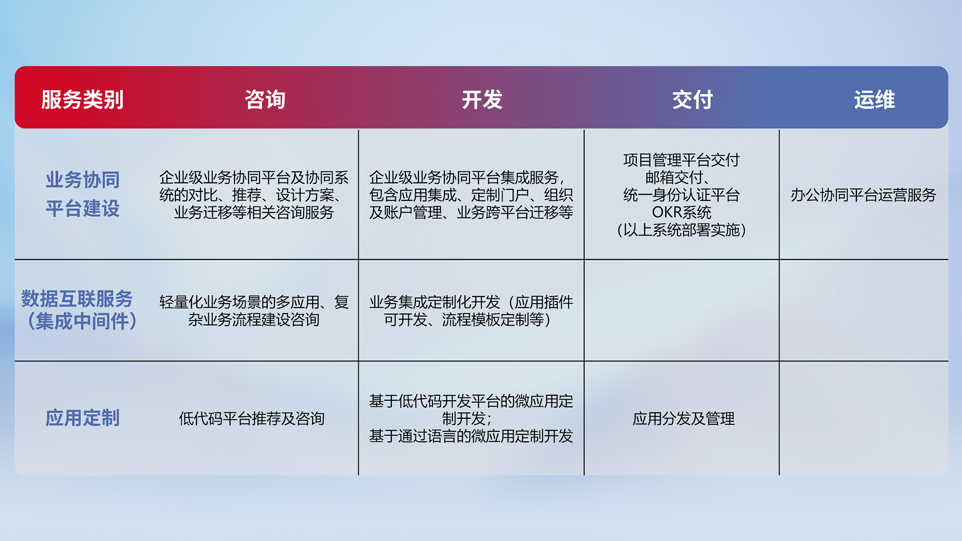 针对钉钉、、、企微、、、、IDaas等平台级产品提供产品的规划、、、方案、、、交付、、、、定制化开发等服务,,,,实现如统一协同办公、、、智能客户服务、、混合会议管理、、智能数据查询、、、、等业务场景,,,,实现数字化转型。。